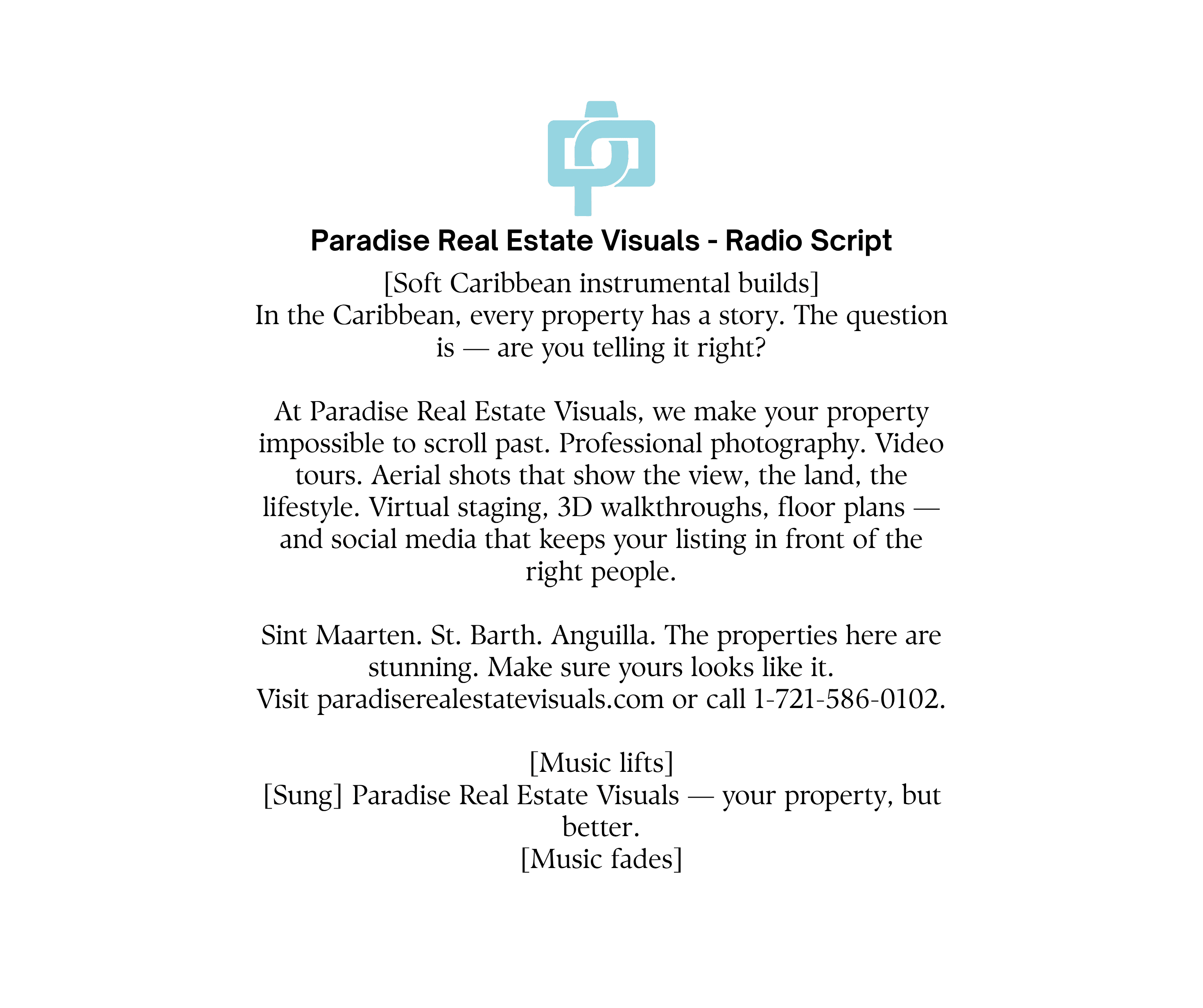 Paradise Real Estate Visuals is a real estate photography, videography and marketing company operating across Sint Maarten, St. Barth, and Anguilla. I wrote this radio script for their on-air advertising. SXM radio culture loves a jingle so I wrote it with a sung closer — something that would stick after the ad ended.