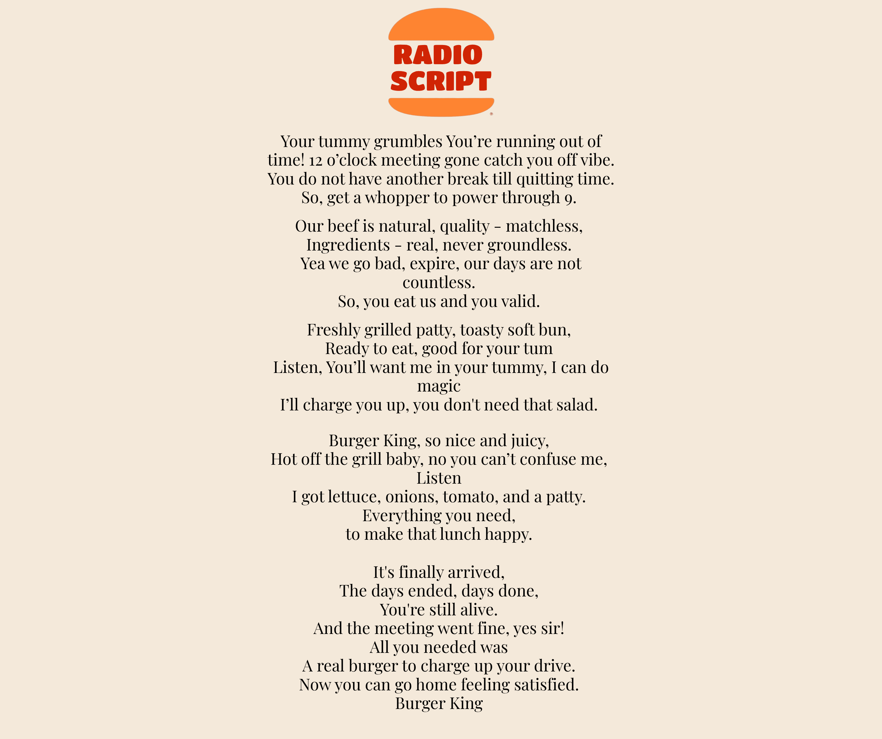 This radio script was written in 2021 for the D&AD New Blood Awards — one of the most respected student and emerging creative award shows in the world. The brief was Burger King, 60 seconds. Instead of writing a straight ad I wrote it as a rap, built around the rhythm of a lunch break, and had someone perform it.
